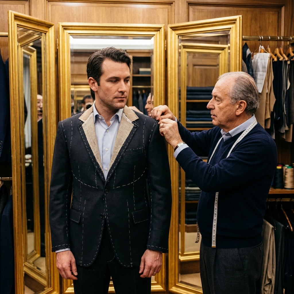 The "basted" fitting. The suit is assembled with temporary white stitching. This is the crucial moment where we mold the canvas to your form and refine the silhouette.